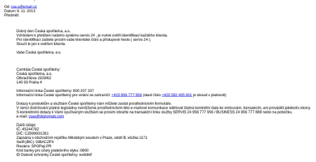 Národní bezpečnostní tým zaznamenal další vlnu falešných zpráv, tentokrát od České spořitelny. Tento e-mail vyzývá oběť k zadání klientského čísla a přístupového hesla ke službě SERVIS 24. E-maily použité pro tuto nekalou činnost jsou csa.s@email.cz a csas@diplomats.com. Pro tyto a další podobné případy platí jedno zásadní pravidlo: důvěrné informace o platebních kartách žádná vydavatelská banka ani kartové asociace od svých klientů prostřednictvím elektronických zpráv nepožadují.